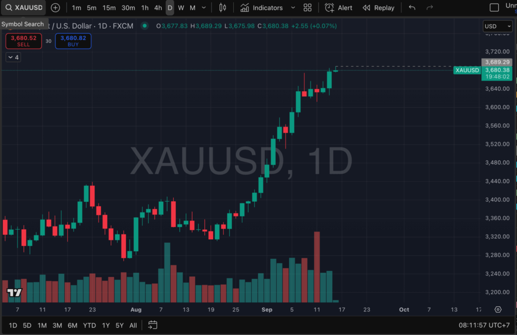 เช้าวันนี้ (16 ก.ย. 2025) ตลาดการเงินทั่วโลกจับตามองราคาทองคำ หลังพุ่งทำสถิติสูงสุดใหม่ (ATH) ที่ระดับ $3,689.29 ต่อเนื่องจากการ Break out ของกราฟราคาเมื่อคืนที่ผ่านมา ขณะเดียวกัน ดัชนี S&P 500 ของสหรัฐฯ ก็ยังคงแรงไม่หยุด  พุ่งต่อเนื่องแตะ 6,625.5 จุด ทุบสถิติสูงสุดใหม่เช่นกัน ช่วงเมื่อคืนที่ผ่านมา