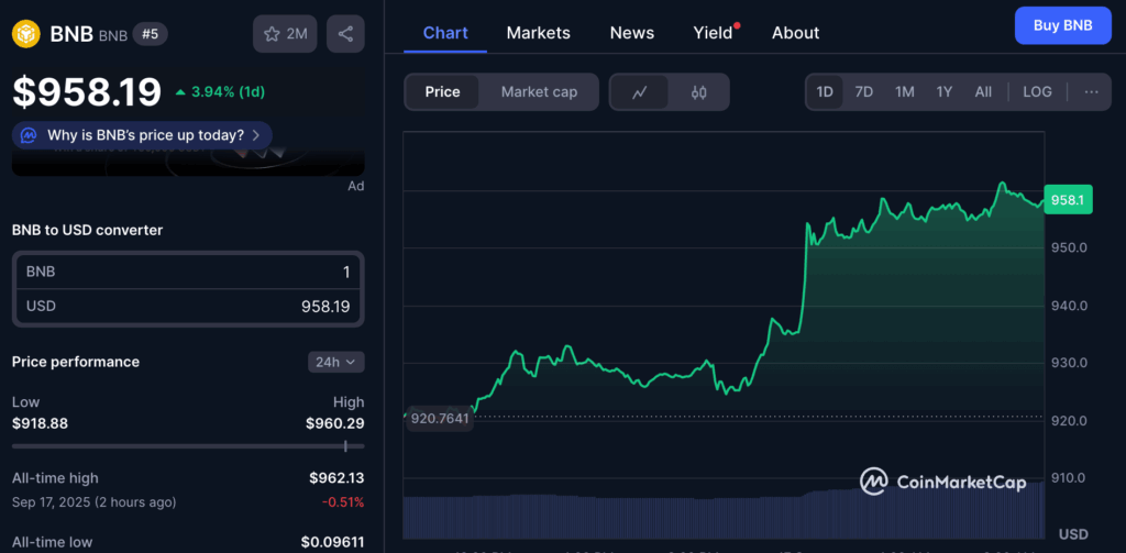 ราคาของ BNB ซึ่งเป็นเหรียญพื้นฐานในระบบนิเวศของ Binance ได้ตอบสนองในทางบวกต่อข่าวนี้ โดยทำราคาสูงสุดใหม่ที่ 962 ดอลลาร์ ในเช้าวันนี้ (17 กันยายน) ซึ่งการพุ่งขึ้นของราคานี้สะท้อนถึงความเชื่อมั่นของนักลงทุนที่มีต่อการเจรจาครั้งนี้และผลกระทบเชิงบวกที่อาจเกิดขึ้นกับอนาคตของ Binance นักวิเคราะห์คาดว่า BNB อาจจะขึ้นไปถึง 1,000 ดอลลาร์ในอนาคตอันใกล้