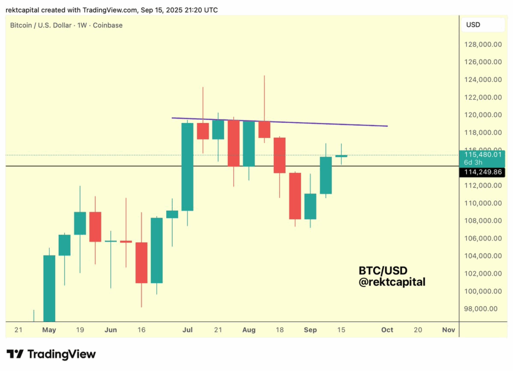 นอกเหนือจากนี้ Rekt Capital ยังกล่าวว่า บิทคอยน์อาจมีการย่อตัวลงมายังแนวรับสำคัญที่ $114,000 เมื่อมองจากกราฟรายสัปดาห์ ก่อนที่จะเด้งกลับไประดับที่สูงกว่า