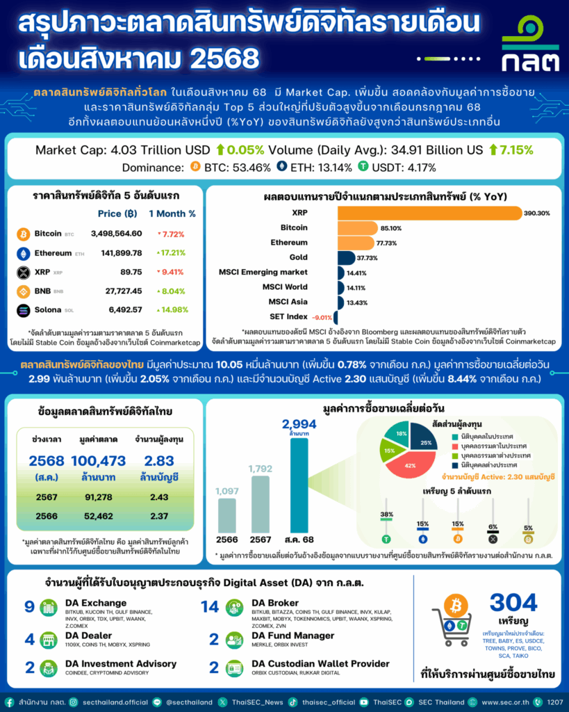 ภาพรายงานสรุปภาวะตลาดสินทรัพย์ดิจิทัล รายเดือนสิงหาคม 2568 สำนักงานคณะกรรมการกำกับหลักทรัพย์และตลาดหลักทรัพย์