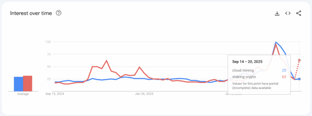 ธุรกิจ Cloud Mining กลับมาได้รับความสนใจอีกครั้ง โดย Google Trends แสดงให้เห็นว่ายอดการค้นหาพุ่งสูงขึ้นในเดือนสิงหาคมนี้ แม้จะควบคู่ไปกับคำอย่าง “staking crypto” ที่มักถูกจัดอยู่ในประเภทการสร้างรายได้แบบ Passive Income เหมือนกัน
