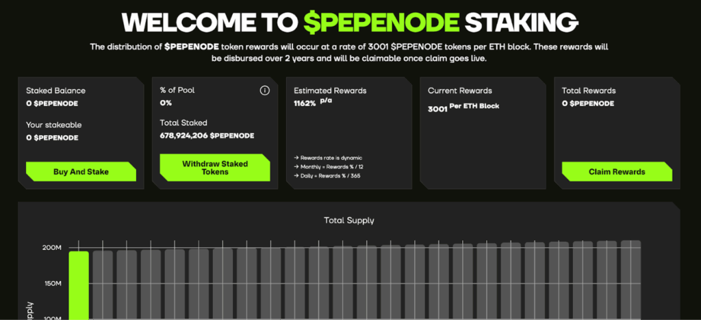 แต่ PepeNode ได้เปลี่ยนสิ่งนั้นด้วยรางวัล Staking แบบไดนามิกที่ปัจจุบันตั้งไว้ที่ 1,162% APY ซึ่งมากพอที่จะเพิ่มเงินลงทุนเป็นสองเท่าได้ในเวลาเพียงสามเดือนกว่า ๆ หากเงื่อนไขยังคงอยู่