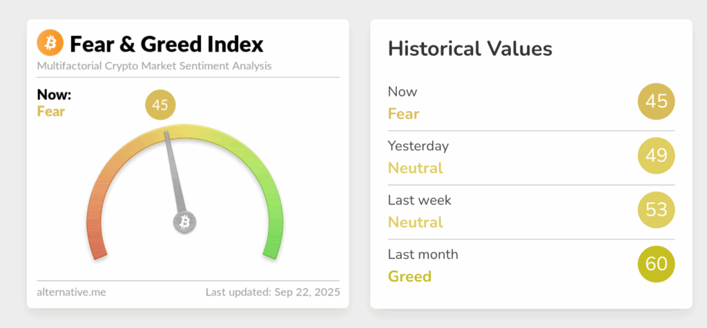 นอกจากนี้ ดัชนี Fear & Greed Index ก็เริ่มส่งสัญญาณที่น่าเป็นกังวล โดยร่วงจากระดับ “ปกติ” ที่ 49 ลงมาอยู่ในโซน “กลัว” ที่ 45 ในวันนี้ ซึ่งสะท้อนให้เห็นว่า ความเชื่อมั่นของนักลงทุนกำลังสั่นคลอน