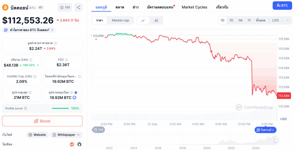 ในขณะที่รายงาน Bitcoin มีการซื้อขายกันอยู่ที่ 112,553 ลดลง 2.64% ในช่วง 24 ชั่วโมงที่ผ่านมา ตามข้อมูลจาก CoinMarketCap