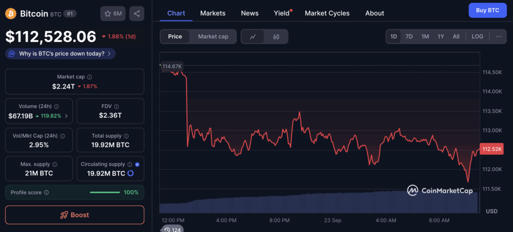 ในขณะที่รายงาน ราคา Bitcoin กำลังซื้อขายอยู่ที่ 112,528 ดอลลาร์ ลดลง 1.88 % ภายใน 24 ชั่วโมง อ้างอิงข้อมูลจาก coinmarketcap