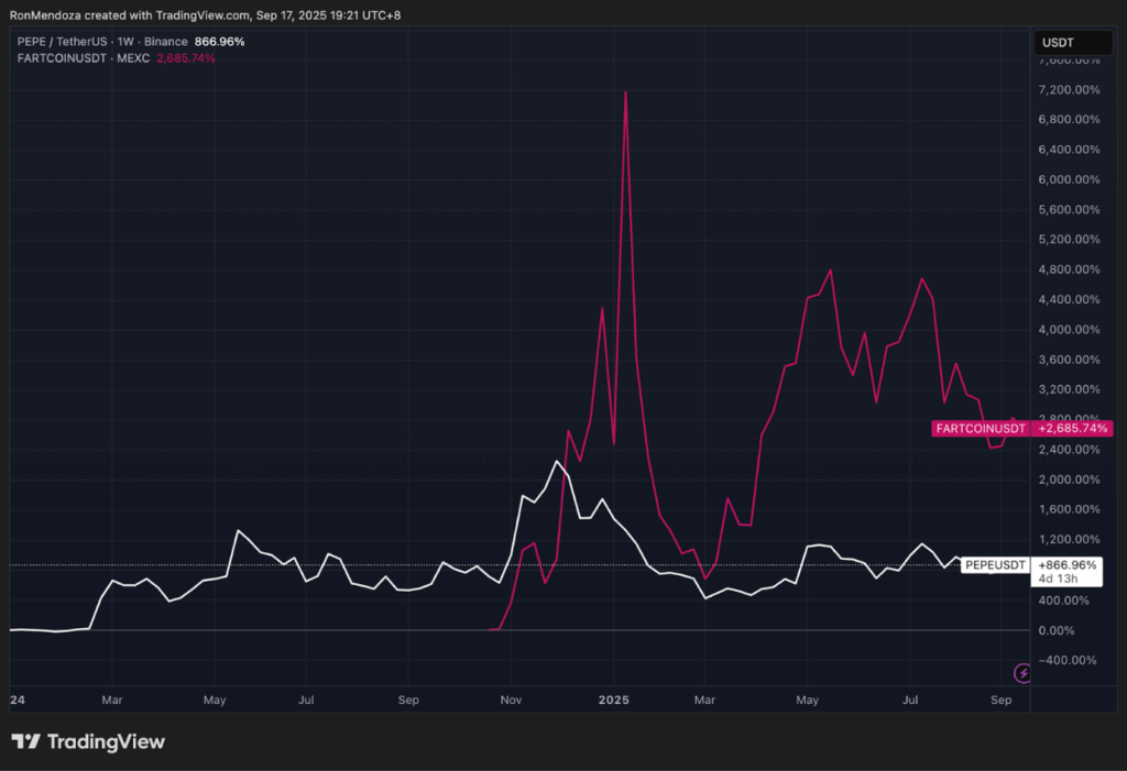 ในขณะที่มูลค่าตลาดรวมของเหรียญมีมกำลังไต่ระดับ กลับไปสู่ 1 แสนล้านดอลลาร์ จึงเป็นเหตุผลที่อาจคาดการณ์ได้ว่า ผู้เล่นที่แข็งแกร่งอย่าง PEPE และ FARTCOIN ซึ่งได้รับการสนับสนุนจากชุมชนที่เหนียวแน่น จะกลายเป็นผู้นำในวัฏจักรครั้งต่อไป ร่วมกับโทเคนดาวรุ่งอย่าง MemeCore (M)