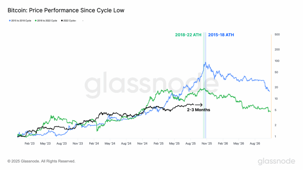 จากการวิเคราะห์ข้อมูลของ Glassnode พบว่า สถานการณ์ของ Bitcoin ในรอบนี้มีลักษณะคล้ายคลึงกับช่วงที่ตลาดเคยทำสถิติสูงสุด (ATH) ในปี 2015-2018 และ 2018-2022 ซึ่งในตอนนั้นราคา Bitcoin มักจะทำ ATH ภายใน 2-3 เดือนหลังจากเข้าสู่ช่วงเวลาดังกล่าว