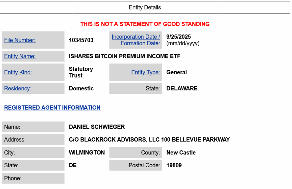 รายละเอียดการยื่นขอ ETF iShares Bitcoin Premium Income ของ BlackRock ที่มา: Delaware