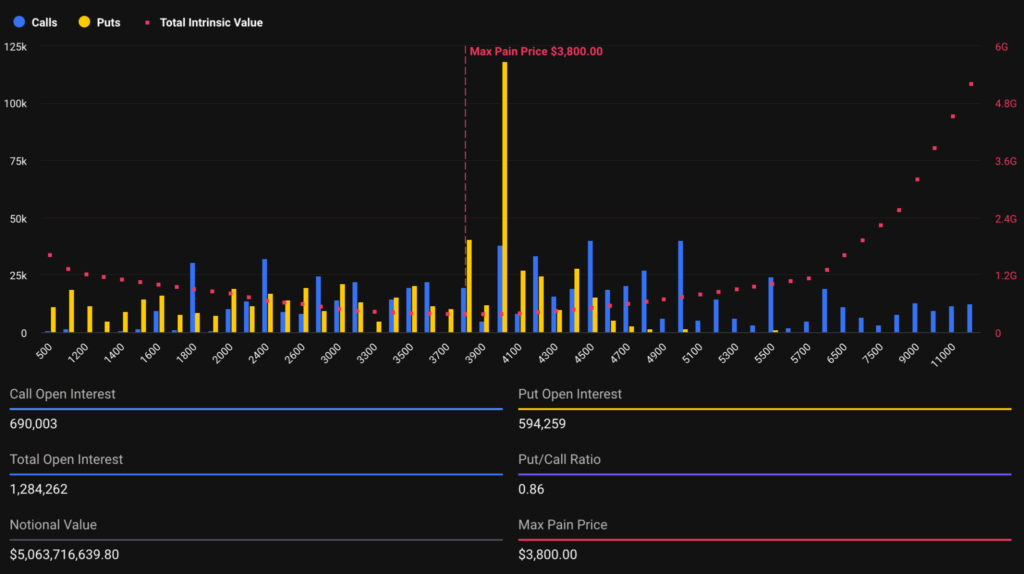 ขณะที่ Ethereum ก็ไม่น่าห่วงไม่แพ้กัน เพราะราคาตอนนี้อยู่ที่ $3,933 ซึ่งใกล้กับจุดที่นักลงทุนส่วนใหญ่ “เจ็บตัวมากที่สุด” หรือที่เรียกว่า Max Pain ที่ $3,800 ถึงแม้จะมีคนเปิดสัญญาเก็งขึ้น (Call) มากกว่าฝั่งเก็งลง (Put) แต่เมื่อเปรียบเทียบกันแล้ว ความได้เปรียบของฝั่ง Call ยังถือว่าน้อย