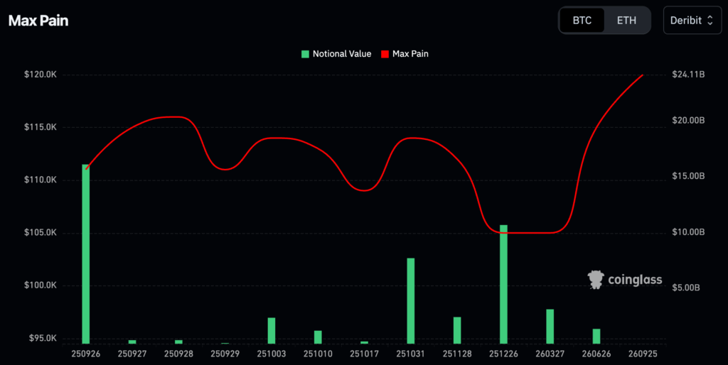 กลับกัน 81% ของสัญญาฝั่ง put ใน Deribit มองว่าราคาจะไปต่ำกว่า $110,000 และจากราคาที่ยังไม่เป็นใจในตอนนี้อาจทำให้นักเทรดฝั่งหมีจะได้แต้มต่อกว่า $1 พันล้าน มาถล่มตลาด ถ้าราคายังไม่ฟื้นเหนือ $110,000 ซึ่งเป็นจุดเจ็บปวดสูงสุด (Max pain)ก่อนหมดอายุสัญญา