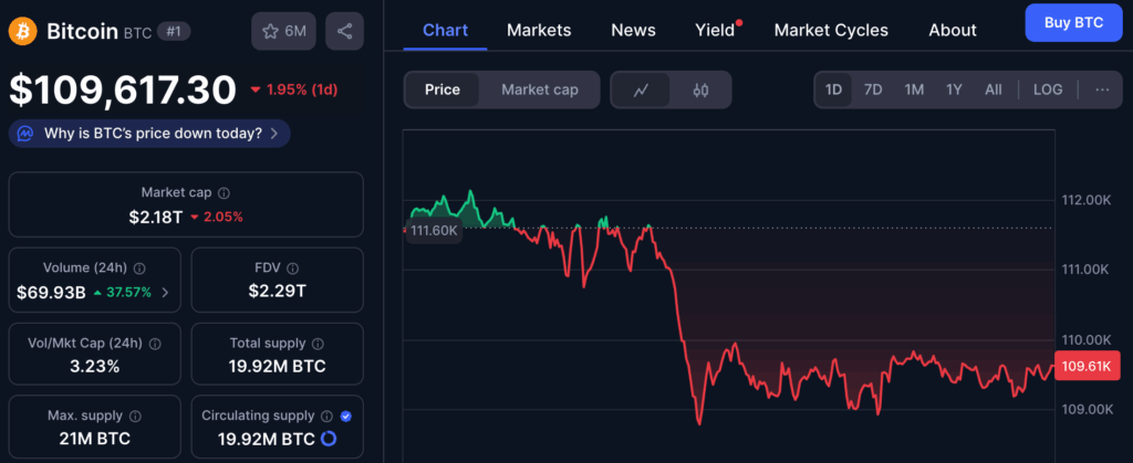 ขณะที่รายงาน Bitcoin มีการซื้อขายอยู่ที่ $109,538 ลดลง 1.96% ในช่วง 24 ชั่วโมงที่ผ่านมา อ้างอิงข้อมูลจาก Coinmarketcap