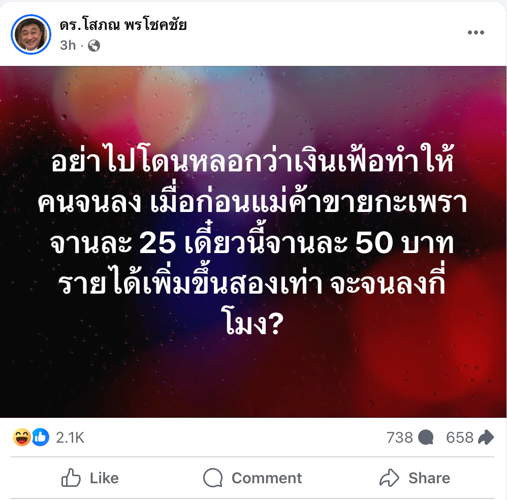 ดร.โสภณ พรโชคชัย นักวิชาการด้านอสังหาริมทรัพย์ ออกมาแสดงความเห็นเกี่ยวกับผลกระทบของเงินเฟ้อผ่านโพสต์ส่วนตัว โดยระบุว่า “อย่าไปหลงเชื่อว่าเงินเฟ้อทำให้คนจนลง” พร้อมยกตัวอย่างให้เห็นภาพว่า “เมื่อก่อนแม่ค้าขายกะเพราจานละ 25 บาท ปัจจุบันขายได้ 50 บาท ถ้าขายแพงขึ้น รายได้ก็เพิ่มขึ้น แล้วจะจนลงได้อย่างไร”