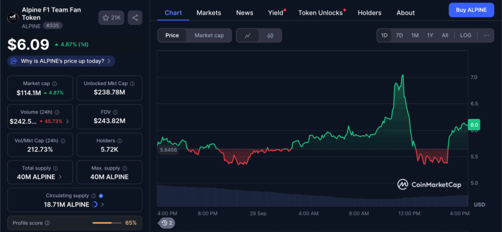 Alpine (ALPINE) เป็น Fan Token อย่างเป็นทางการของทีมแข่งรถ BWT Alpine F1® Team ซึ่งเป็นทีมที่เข้าร่วมการแข่งขัน Formula 1 (ฟอร์มูล่าวัน) กำลังเผชิญกับสถานการณ์ที่แตกต่าง แต่ก็น่าเป็นห่วงไม่แพ้กัน เพราะถึงแม้ราคาจะร่วงลงเกือบ 7% ภายใน 24 ชั่วโมงมาอยู่ที่ 5.37 ดอลลาร์ แต่สัญญาณทางเทคนิคยังคงบ่งชี้ว่า ราคายังอยู่ในโซนที่มีแรงซื้อเกินจริง