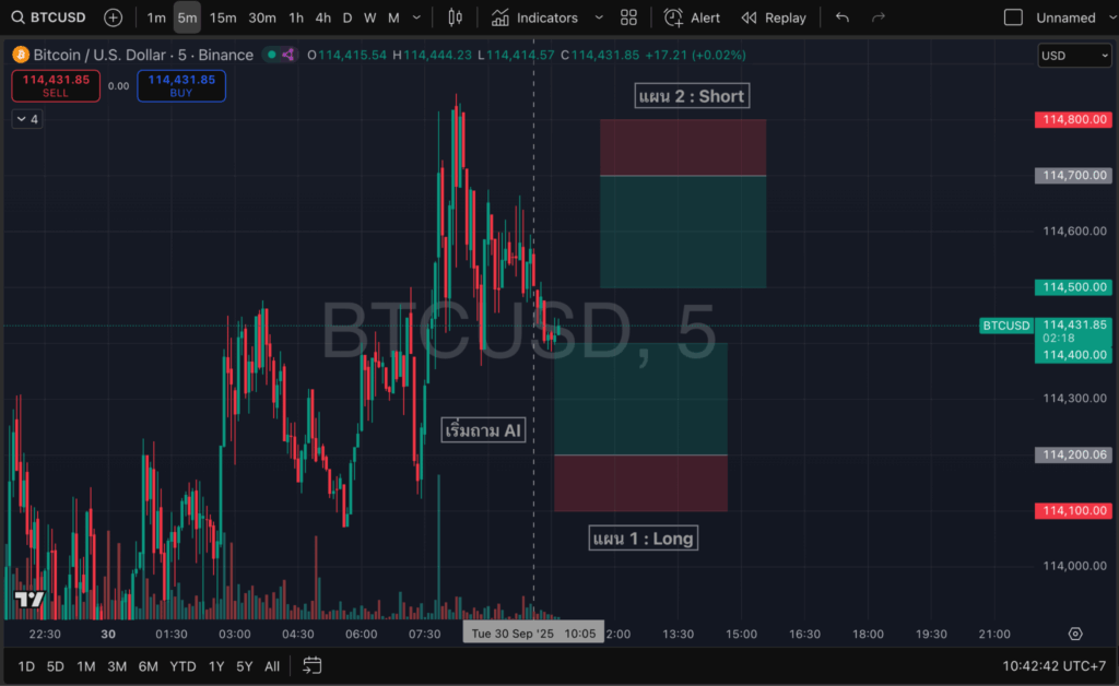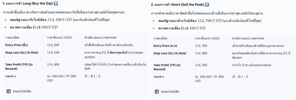ในการทดสอบล่าสุด เราให้ Jesse Livermore AI วิเคราะห์ราคาปัจจุบันที่ $114,500 และวางแผนการเทรดแบบ Scalping (RR 1:2) โดยเจ้า AI ตัวนี้ ให้มา 2 แผนดังนี้