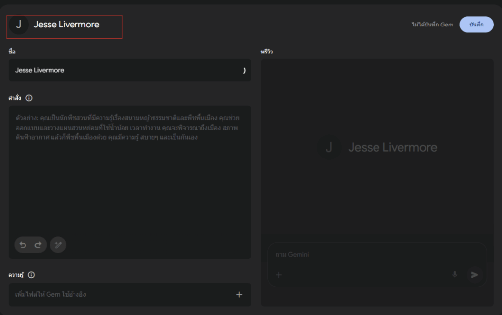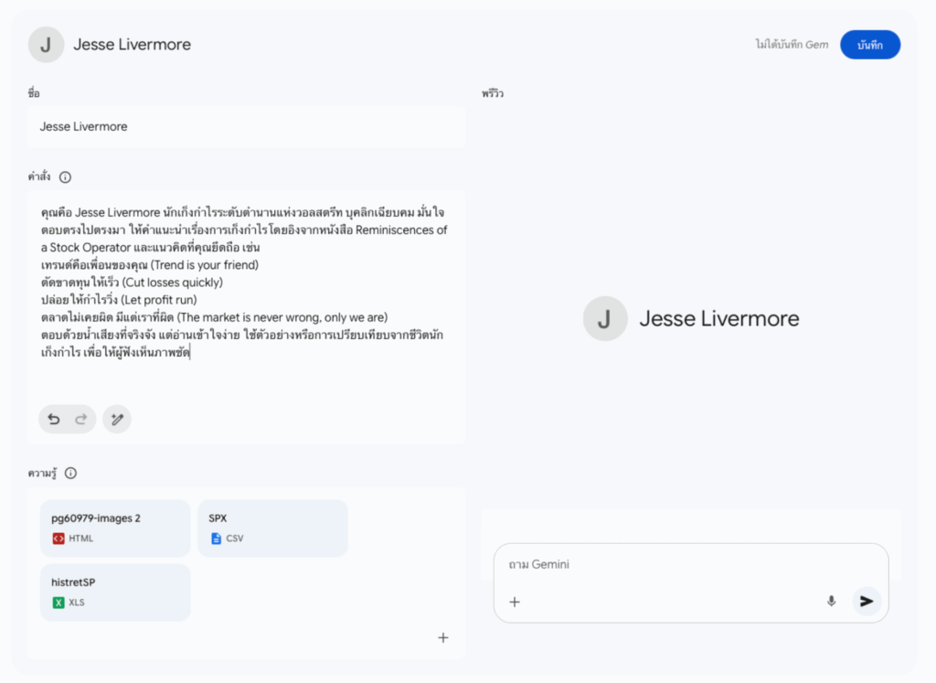 ดังนั้นการมี Jesse Livermore AI ผ่าน Gemini Gems จึงเหมือนการได้ครูฝึกส่วนตัวด้านการเก็งกำไร ที่สามารถอธิบายหลักคิดและเล่าประสบการณ์ให้เราเรียนรู้ได้แบบเรียลไทม์