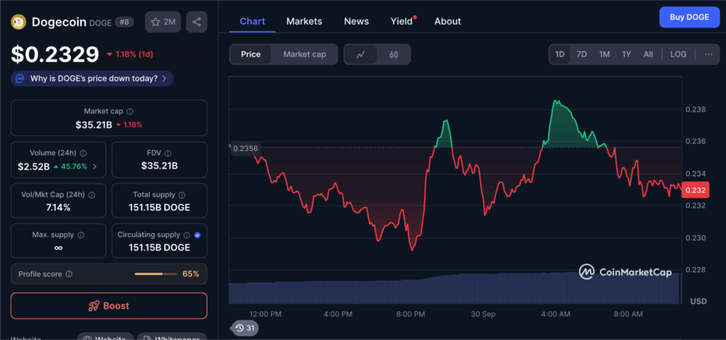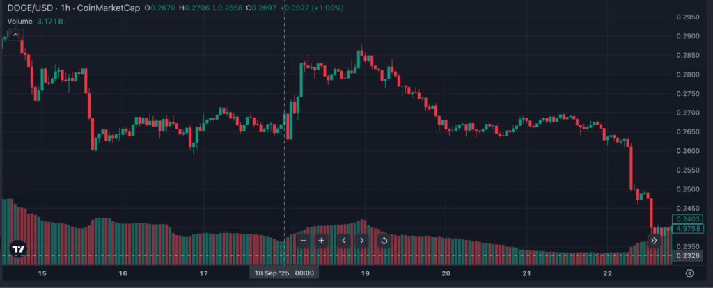 ณ สิ้นเดือนกันยายน 2025 ราคา Dogecoin อยู่ที่ประมาณ 0.22-0.24 ดอลลาร์สหรัฐ และที่น่าสนใจคือ เหรียญนี้ได้เพิ่มมูลค่าขึ้นถึง 131.9% เมื่อเทียบกับปีที่แล้ว ซึ่งถือว่าเป็นผลตอบแทนที่น่าประทับใจมาก