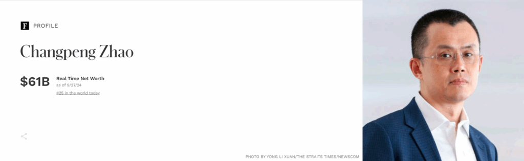ข้อมูลจากเว็บไซต์ Forbes เคยประเมินมูลค่าทรัพย์สินของ CZ ไว้ที่ประมาณ 61,000 ล้านดอลลาร์ ในวันที่เขาเดินออกจากคุก แต่ล่าสุด Forbes ระบุว่า CZ มีความมั่งคั่งอยู่ที่ 80,600 ล้านดอลลาร์ ซึ่งเพิ่มขึ้นเกือบ 20,000 ล้านดอลลาร์