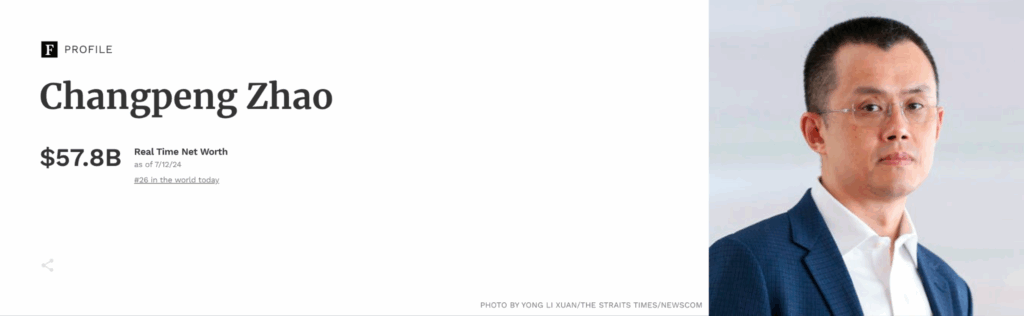ซึ่งข้อมูลที่บันทึกไว้ ช่วงที่ CZ ยังอยู่ในคุก เมื่อวันที่ 7 พฤษภาคม ระบุว่า ทรัพย์สินของ CZ มีมูลค่าอยู่ที่ 33,000 ล้านดอลลาร์ โดยมูลค่าทรัพย์สินของ CZ เพิ่มขึ้นเป็น 57,800 ล้านดอลลาร์ เมื่อวันที่ 12 กรกฎาคม