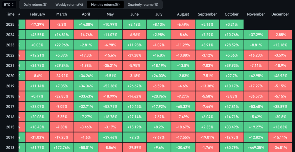 ตารางผลตอบแทนรายเดือนจาก Coinglass เปิดเผยว่า ในเดือนกันยายนนี้ บิทคอยน์สามารถปิดบวกได้สูงถึง +5.16% ซึ่งนับว่าเป็นผลตอบแทนที่ดีที่สุดเป็นลำดับที่สามนับตั้งแต่มีการจัดเก็บข้อมูลตลอด 13 ปีที่ผ่านมา โดยตัวเลขดังกล่าวเป็นรองเพียงปี 2016 และ 2024 เท่านั้น