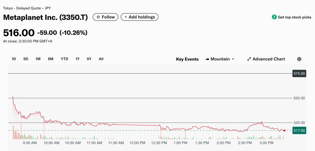 ในขณะที่รายงาน ราคาหุ้น Metaplanet มีการซื้อขายอยู่ที่ 516 เยนต่อหุ้น ลดลง 10.26% ตามข้อมูลจาก Yahoo.finance