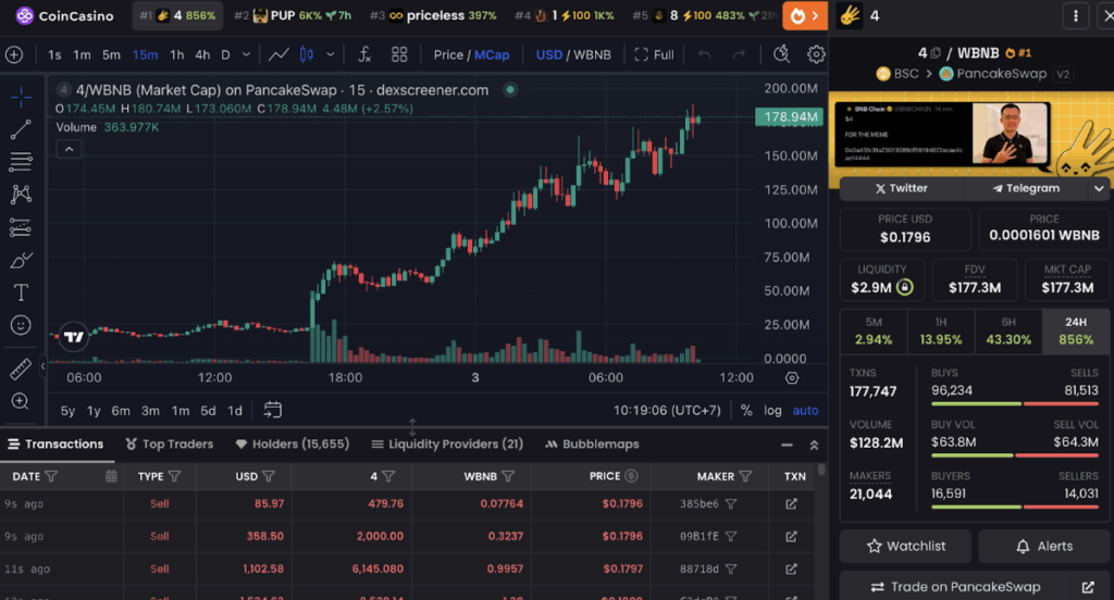 ในขณะที่รายงาน มูลค่าตลาดของเหรียญ “4” ยังคงปรับตัวขึ้นไม่หยุด โดยปัจจุบันมีมูลค่าตลาดสูงถึง 177 ล้านดอลลาร์  คิดเป็นการเพิ่มขึ้นมากกว่า 800%ภายใน 24 ชั่วโมงที่ผ่านา ตามข้อมูลจาก Dexscreener