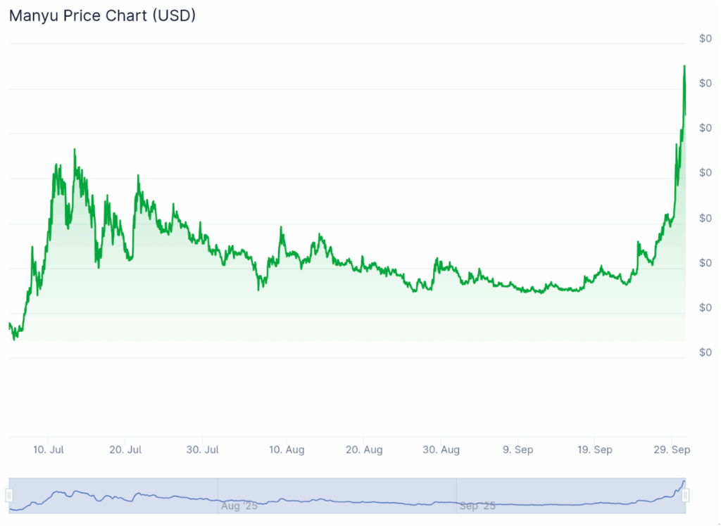 ฝั่งคู่แข่งอย่าง MANYU ก็กำลังร้อนแรง โดยพุ่งขึ้นกว่า 1,488% จากจุดต่ำสุดในเดือนกรกฎาคม และเพิ่งทะยานเพิ่มอีก 45% ใน 24 ชั่วโมง ล่าสุด หลังอัปเกรดเข้าสู่ Chainlink CCIP ที่เปิดทางเชื่อมโยงข้ามเชนได้หลายเครือข่าย