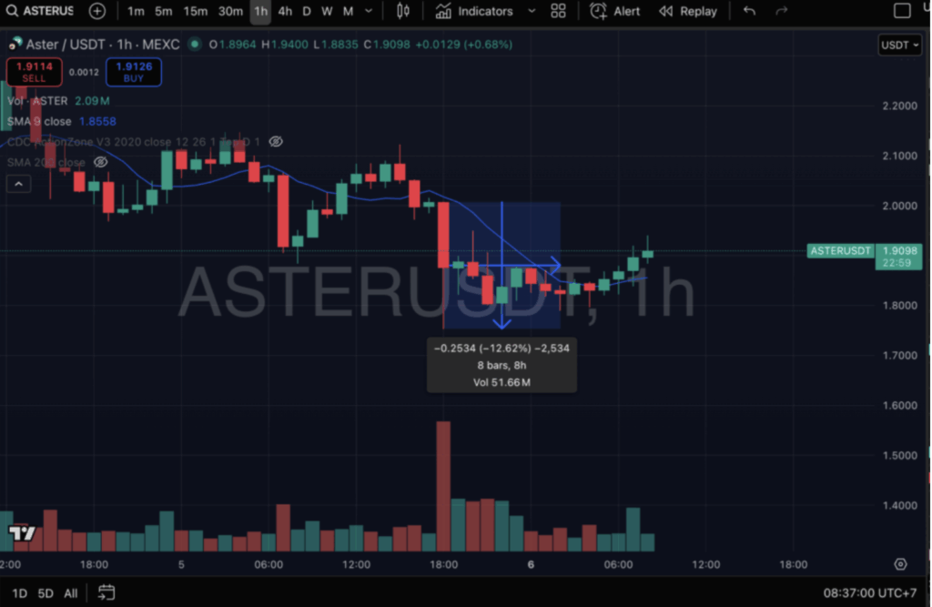 ในขณะที่รายงาน ราคาเหรียญ ASTER เริ่มมีการฟื้นตัวขึ้นจากจุดต่ำสุด โดยมีราคาซื้อขายอยู่ที่ 1.90 ดอลลาร์ ลดลงประมาณ 1.95% ในช่วง 24 ชั่วโมงที่ผ่นมา ตามข้อมูลจาก CoinMarketCap