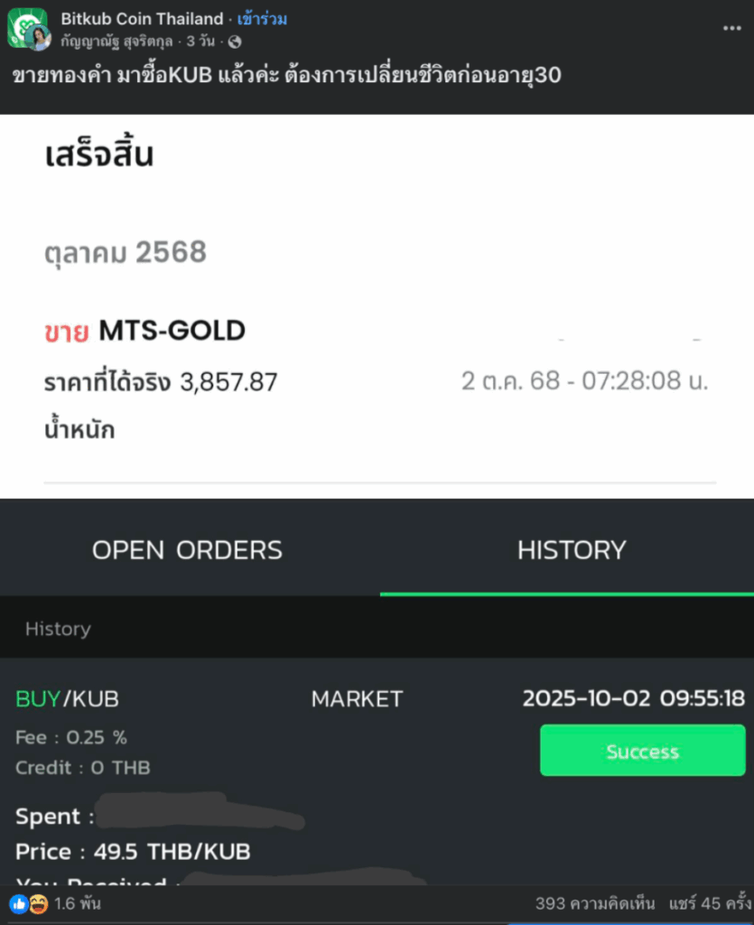 จากภาพที่เธอโพสต์เผยให้เห็นชัดว่า เธอขายทองออก “เกือบจุดสูงสุดของรอบ” ที่ราว $3,857 ต่อทรอยออนซ์ ก่อนจะนำเงินทั้งหมดไปซื้อ KUB ที่ราคา 49.5 บาทต่อเหรียญ ทั้งนี้ ตัวเจ้าของโพสต์ไม่ได้เปิดเผยรายละเอียดว่า ลงทุนด้วยเงินจำนวนเท่าไหร่