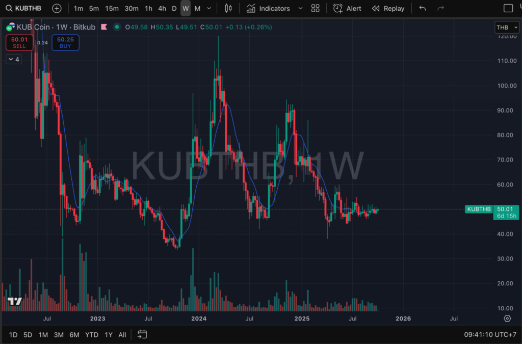 ส่วนทางฝั่งราคา KUB ปัจจุบันมีการซื้อขายอยู่ที่ 50.01 บาท ปรับตัวขึ้นราว 2.14% ในช่วง 7 วันที่ผ่านมา ตามข้อมูลจากกระดานเทรด Bitkub