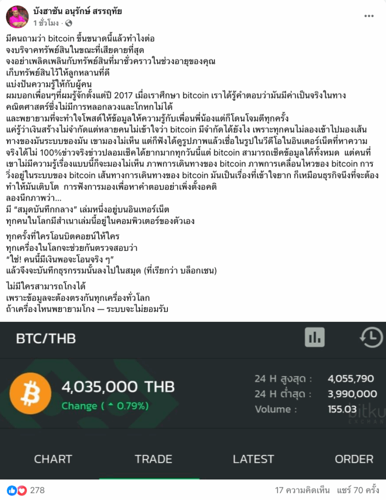 ในวันนี้ (7 ตุลาคม) บังฮาซันได้โพสต์ภาพราคาบิทคอยน์จากเว็บเทรด Bitkub ที่ระดับ 4,035,000 บาท พร้อมตอบคำถามที่หลายคนสงสัยว่า