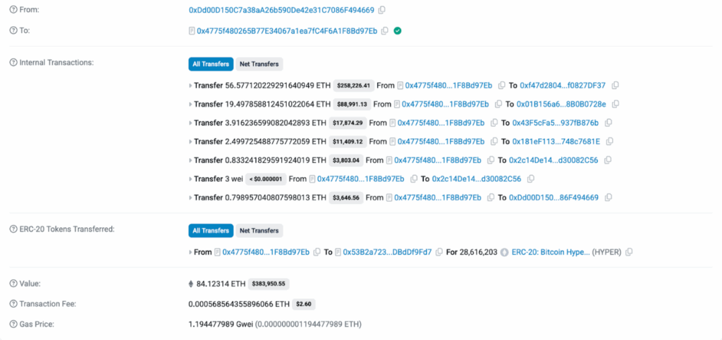 ก่อนหน้านั้นเพียงไม่กี่วัน วันที่ 29 กันยายน นักลงทุรายหนึ่งทำการซื้อ 3 ครั้งต่อเนื่อง รวมเป็น 24.6 ล้าน HYPER มูลค่า 327,000 ดอลลาร์ และล่าสุดในช่วงสุดสัปดาห์ วอลเล็ตใหม่เข้าร่วมการซื้อใหญ่ 2 ครั้ง รวมมูลค่ากว่า 560,000 ดอลลาร์ คิดเป็น 13.6 ล้าน HYPER มูลค่า 182,000 ดอลลาร์ และ 28.6 ล้าน HYPER มูลค่า 382,000 ดอลลาร์