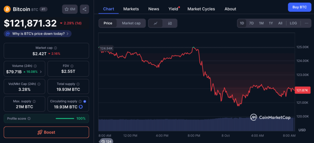 ปัจจุบันราคาของ Bitcoin ซื้อขายอยู่ที่ $121,871 ซึ่งปรับตัวลดลงเล็กน้อย หลังจากเพิ่งทำสถิติสูงสุดตลอดกาลใหม่ (ATH) ที่ $126,200 เมื่อวันจันทร์ที่ผ่านมา ซึ่งราคา Bitcoin จะต้องปรับตัวเพิ่มขึ้นอีกประมาณ 14.7% จากมูลค่าปัจจุบัน เพื่อให้เป็นไปตามการคาดการณ์ของ Peterson