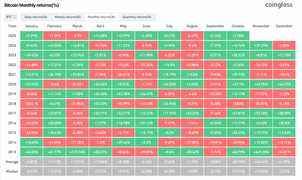ตามข้อมูลของ CoinGlass เดือนตุลาคม ถือเป็นเดือนที่ Bitcoin ทำผลงานได้ดีที่สุดเป็นอันดับสอง โดยเฉลี่ยตั้งแต่ปี 2013 โดย Bitcoin สามารถทำกำไรเฉลี่ยที่ 20.75%