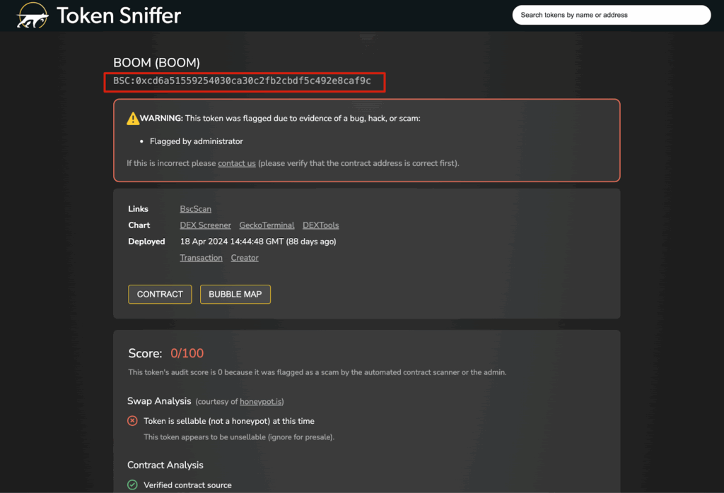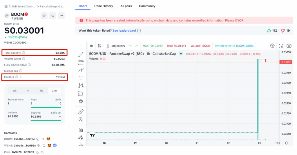 ในปี 2024 ทีมงานของ Binance เจอโทเคนปลอมที่ชื่อว่า BOOM ซึ่งมันน่าสนใจมากเพราะมีสัญญาณเตือนเต็มไปหมด แรกเลย liquidity ในพูลมีแค่ $3,380  แต่กลับมีที่อยู่ที่ได้รับโทเคนนี้ไปมากกว่า 11 ล้านที่อยู่ ซึ่งมันดูไม่ปกติเลย เพราะโทเคนปกติจะมี liquidity สูงถ้ามีคนถือเยอะ