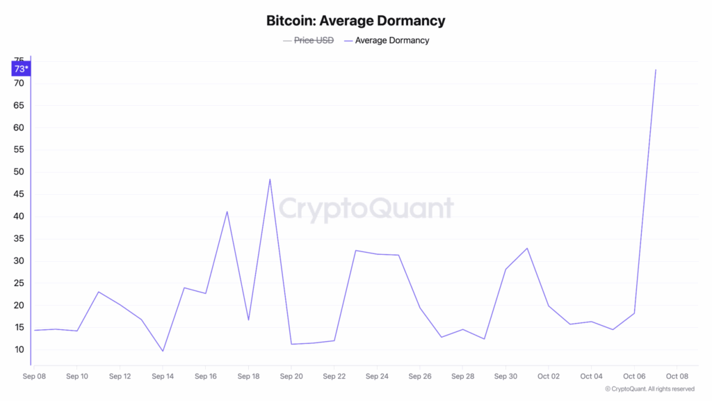 ไม่เพียงเท่านั้น ตลาดยังเริ่มส่งสัญญาณถึง “แรงเทขาย” จากนักลงทุนรุ่นเก่าที่เริ่มทยอยทำกำไรออกมาแล้ว โดยข้อมูลจาก CryptoQuant ชี้ว่า ค่าเฉลี่ยการเคลื่อนไหวของกระเป๋า Whale Wallets หรือที่เรียกกันว่า “การตื่นของเจ้ามือ” ได้เพิ่มสูงขึ้นอย่างมีนัยสำคัญ โดยเฉพาะในช่วงเดือนตุลาคมที่ผ่านมา ซึ่งมักเป็นสัญญาณว่ากลุ่มผู้ถือระยะยาวเริ่มขยับตัวหลังเก็บเหรียญไว้เงียบ ๆ มานาน