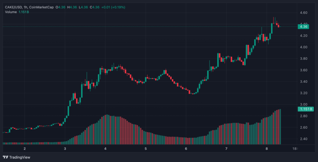อ้างอิงข้อมูลจากกราฟ CAKE/USD พบว่า ตลอดสัปดาห์ที่ผ่านมา ราคาของเหรียญ CAKE ได้ทะยานจากระดับ 2.5 ดอลลาร์ ขึ้นไปแตะจุดสูงสุดที่ 4.47 ดอลลาร์ ซึ่งถือเป็นการปรับตัวครั้งใหญ่ที่สุดในรอบหลายเดือน ขณะที่ในวันนี้ (8 ตุลาคม) เพียงวันเดียว ราคายังเพิ่มขึ้นต่อเนื่องกว่า 15% ทำให้ CAKE กลายเป็นหนึ่งในเหรียญที่ทำผลงานโดดเด่นที่สุดของวัน แม้ภาพรวมตลาดคริปโตจะอยู่ในช่วง “พักฐาน” หลัง Bitcoin ร่วงลงมาที่ระดับ 120,000 ดอลลาร์ก็ตาม