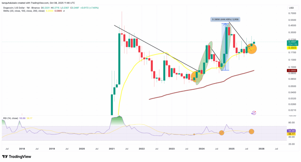 ครั้งล่าสุดที่สัญญาณดังกล่าวปรากฏในช่วงเวลาเดียวกันในปี 2024 ราคาของ DOGE ได้พุ่งทะยานไปถึง 445% ในขณะที่ปี 2023 พุ่งไปกว่า 302%