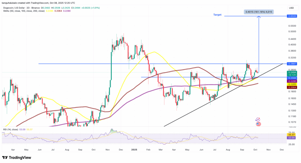 นอกจากนี้ การเคลื่อนไหวในรูปแบบของสามเหลี่ยมยกตัวขึ้นบนกราฟ TF รายสองวันยังเสริมแรงคาดการณ์ด้วยว่า ราคาของ Doge อาจพุ่งอย่างน้อย 161% จากระดับราคาปัจจุบันไปยังระดับ $0.65