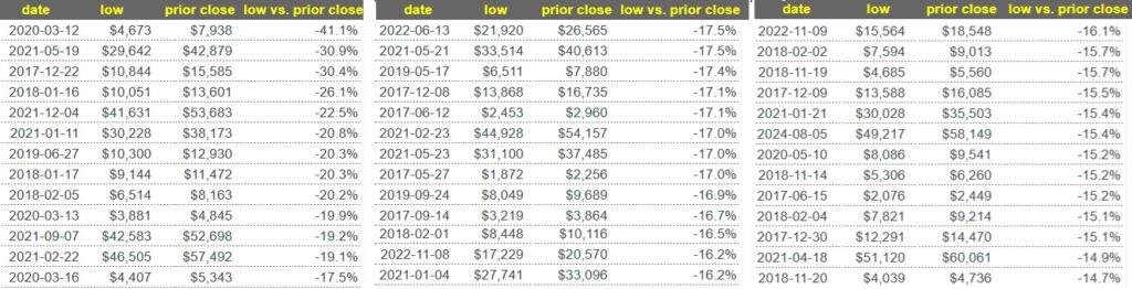 - วันที่ 9 พฤศจิกายน 2022 ราคา BTC ดิ่ง 16.1% เหลือ 15,590 ดอลลาร์ หลังการล่มสลายของ FTX