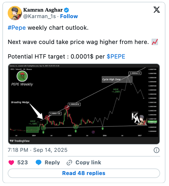 นักเทรดคริปโตชื่อดัง Kamran Asghar ได้ระบุรูปแบบกราฟ Broadening Wedge บนกราฟของ PEPE ซึ่งบ่งชี้ถึงแนวโน้มการขยายตัวของราคาในเฟสใหม่ ที่อาจเกิดขึ้น ต่อเนื่องไปจนถึงปี 2026 หรือ 2027
