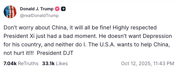 สิ่งที่น่าจับตาคือ การตอบสนองทางการเมืองที่รวดเร็วภายใน 48 ชั่วโมงหลังเกิดเหตุ วันอาทิตย์ที่ 12 ตุลาคม 68 ทรัมป์ออกมาโพสต์บน Truth Social ด้วยถ้อยคำที่สื่อถึงการ “ลดความตึงเครียด” กับจีน
