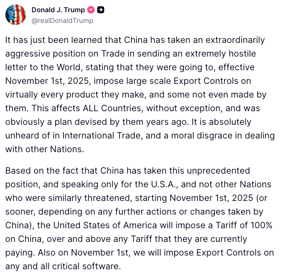 ชนวนสาเหตุเริ่มต้นจากการประกาศของประธานาธิบดีโดนัลด์ ทรัมป์ ว่าสหรัฐฯ จะเรียกเก็บภาษีนำเข้าจากจีนเพิ่มอีก 100% เริ่มตั้งแต่วันที่ 1 พฤศจิกายน 68 เป็นต้นไป การประกาศครั้งนี้ยังรวมถึงการควบคุมการส่งออก “ซอฟต์แวร์ที่สำคัญ” ซึ่งเป็นการยกระดับความขัดแย้งทางการค้าครั้งใหม่