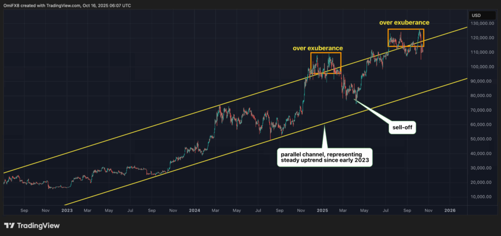ข้อมูลจากภาพด้านบนจะเห็นได้ว่า แนวโน้มขาขึ้นของ Bitcoin ตั้งแต่ปี 2023 ส่วนใหญ่มีความมั่นคงและยั่งยืน แต่ในช่วงไม่กี่สัปดาห์ที่ผ่านมา ราคา Bitcoin ได้แตะถึงขอบบนของช่องที่ถูกกำหนดไว้ซ้ำแล้วซ้ำเล่า ซึ่งส่งสัญญาณสภาวะซื้อมากเกินไป การทะลุแนวต้านเหล่านี้เกิดขึ้นเพียงช่วงสั้นๆ แต่ราคาร่วงลงอย่างรวดเร็ว ซึ่งบ่งชี้ถึง ความอ่อนแรงของผู้ซื้อ