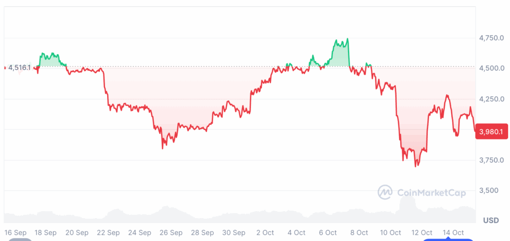ก่อนที่ตลาดคริปโตจะร่วงแรงในวันที่ 10 ตุลาคม ราคา ETH เคยซื้อขายอยู่เหนือระดับ 4,300 ดอลลาร์ แต่หลังจากเกิดแรงขายและการถูกล้างพอร์ตกว่า 19,000 ล้านดอลลาร์ในตลาด ราคา ETH ก็ร่วงลงมาซื้อขายต่ำกว่า 4,000 ดอลลาร์ โดยอยู่ที่ประมาณ 3,980 ดอลลาร์