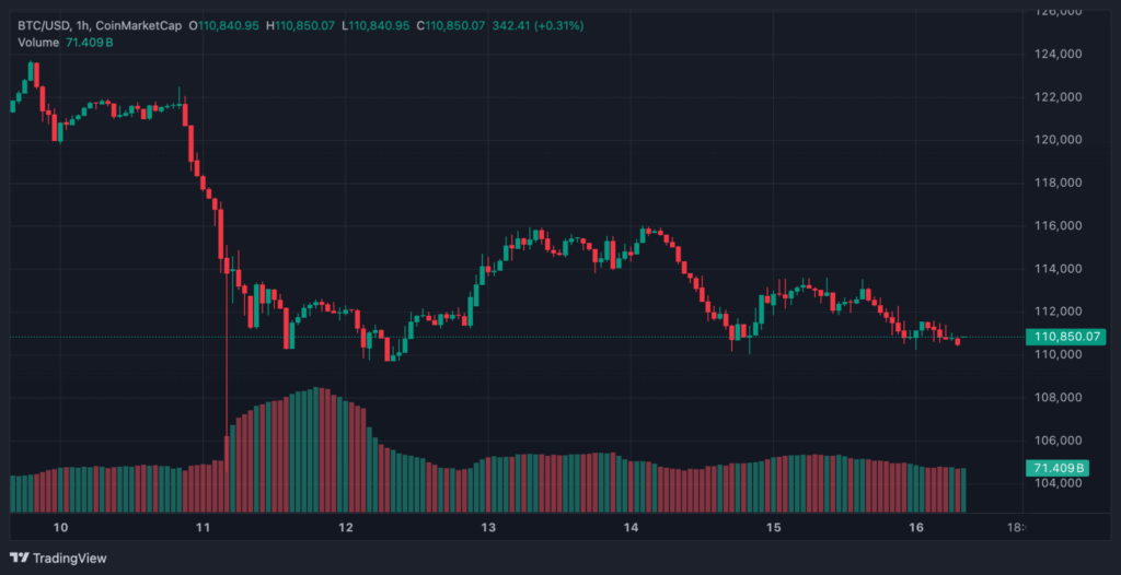 อ้างอิงข้อมูลจากกราฟ BTC/USD บน Coinmarketcap พบว่าในช่วง 24 ชั่วโมงที่ผ่านมาราคาของ Bitcoin ได้ร่วงต่ออีกกว่า 1.48% แตะจุดต่ำสุดระหว่างวันที่ $110,164 และยังคงเคลื่อนไหวในกรอบแคบ ๆ ที่ระหว่าง $111,000 – $110,000