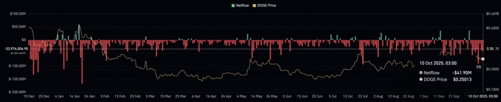 - การไหลออกของเหรียญ (Exchange Outflow): ข้อมูลจาก CoinGlass แสดงให้เห็นว่ามี Dogecoin มูลค่าประมาณ $41.90 ล้านดอลลาร์ ถูกถอนออกจากกระดานเทรดอย่างต่อเนื่อง ซึ่งสะท้อนถึงการ “สะสม” (Accumulation) ของเหล่าเจ้ามือแทนที่จะขายออก