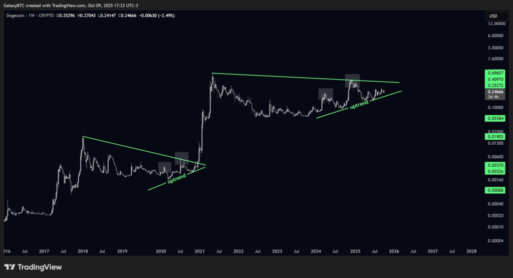 - รูปแบบสามเหลี่ยมขาขึ้น (Ascending Triangle): กราฟรายสัปดาห์ของ DOGE แสดงรูปแบบการสะสมตัวใต้แนวต้านเดิมในระยะยาว โดยมี “จุดต่ำสุดที่สูงขึ้นอย่างต่อเนื่อง” (Higher Lows) โดยมีฐานราคาแข็งแกร่งอยู่ที่ราว $0.24