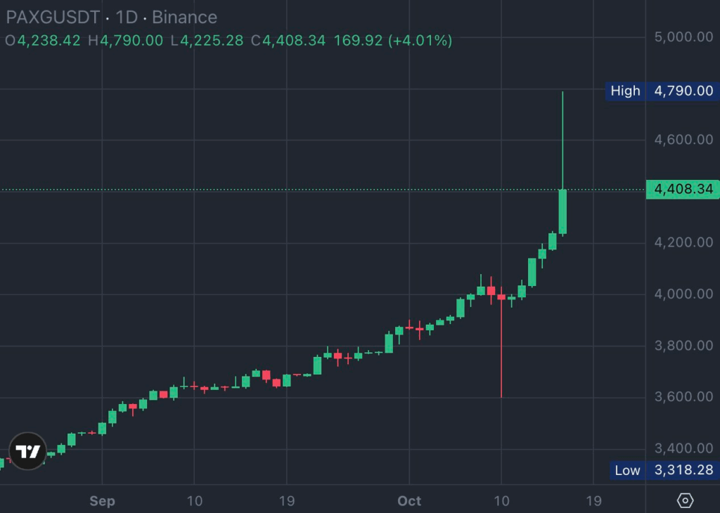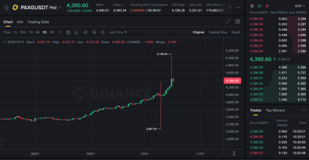 ในช่วงตี 5 ของวันนี้ (16 ต.ค.) นักลงทุนคริปโตทั่วโลกถึงกับงง เมื่อราคา PAXG ในตลาด Binance Futures พุ่งไปถึง $5,106 ซึ่งสูงกว่าราคาทองคำในตลาดโลกที่มีราคาซื้อขายอยู่ที่ $4,379 ถึง 14% ซึ่งหมายความว่า นักลงทุนที่ต้องการซื้อ “ทองคำดิจิทัล” บน Binance ในช่วงนั้น ต้องจ่ายแพงกว่ามูลค่าที่แท้จริงอย่างมากเลยทีเดียว