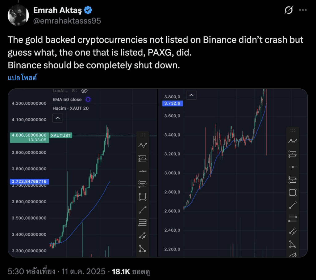 เรื่องนี้ไม่ได้เกิดขึ้นแค่เพียงในตลาด Futures แต่ในตลาด Spot ของ Binance ราคา PAXG ก็ดีดขึ้นอย่างผิดปกติเช่นเดียวกัน ขณะที่ทองคำโลกมีราคาอยู่ที่ $4,379 ต่อทรอยออนซ์ แต่ราคา PAXG กลับวิ่งขึ้นมาที่ $4,790 สูงกว่าราคาทองกว่า 9%