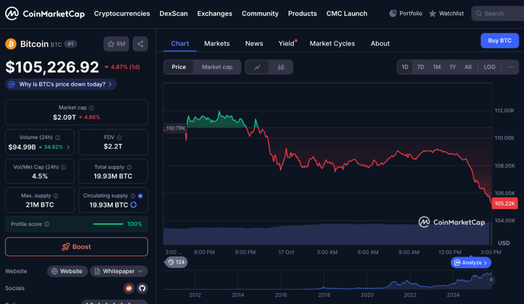 ในขณะที่รายงาน Bitcoin มีการซื้อขายอยู่ที่ $105,226 ลดลง 4.67% ในช่วง 24 ชั่วโมงที่ผ่านมา ตามข้อมูลจาก CoinMarketCap
